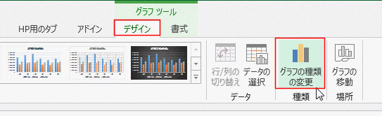 - グラフを選択して、グラフツールの[デザイン]タブで[グラフの種類の変更]を実行します。