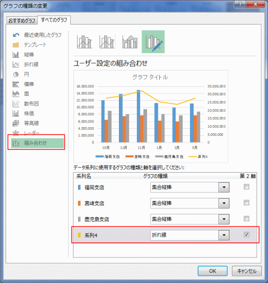 - [組み合わせ]を選択し、「系列4」を「折れ線」にします。第2軸にチェックを入れます。