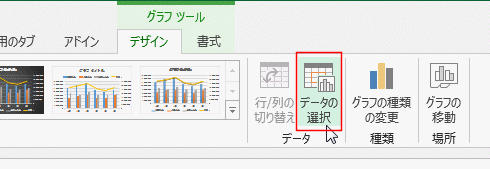 グラフを選択して、グラフツールの[デザイン]タブで[データの選択]を実行します。