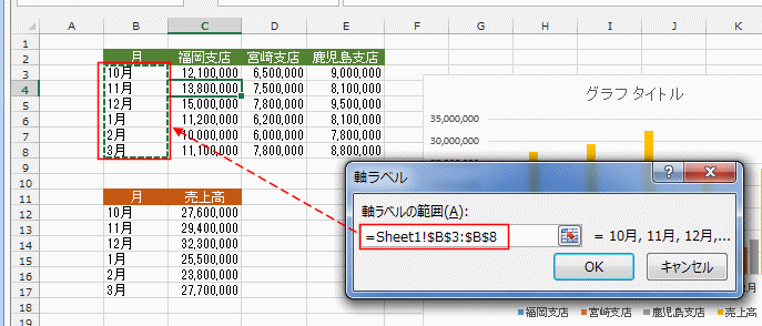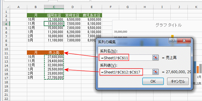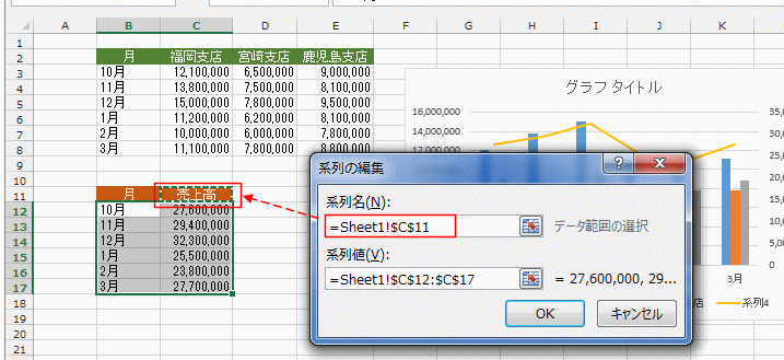 - 系列名と系列値で別表のそれぞれのセルを指定します。