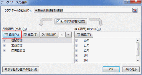 - 凡例項目(系列)の[追加]ボタンをクリックします。