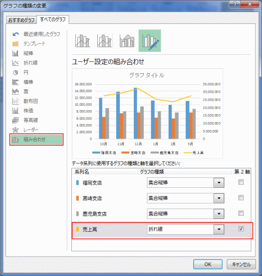 - [組み合わせ]を選択し、「売上高」を「折れ線」にします。第2軸にチェックを入れます。