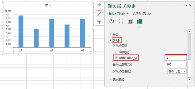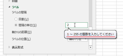 下図では「2」と設定しましたので、ラベルの間隔が「2」になりました。