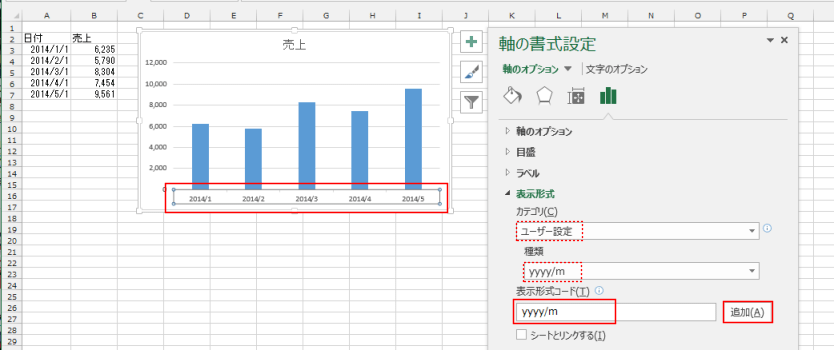 カテゴリが[ユーザー定義]に変わり、種類に「yyyy/m」が登録され、グラフの軸ラベルが変更されました。