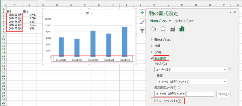 - シートのセルの表示形式を変更して、軸の書式設定の[表示形式]で「シートとリンクする」にチェックを入れます。