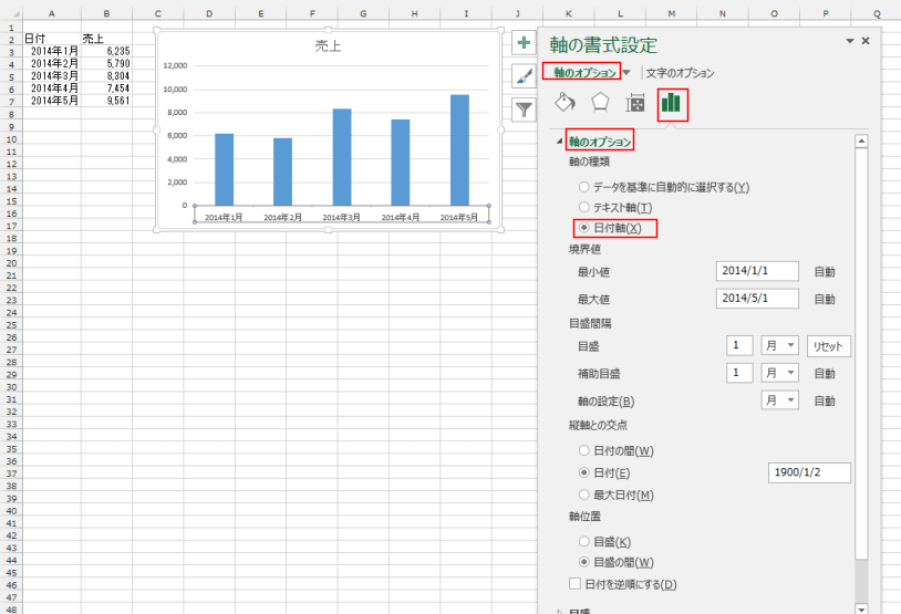 ここでは、軸の種類を「日付軸」としています。