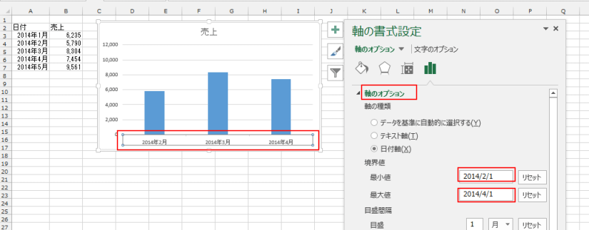 下図では最小値を「2014/2/1」、最大値を「2014/4/1」と変更しています。