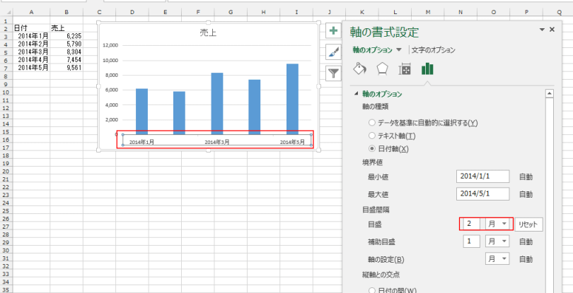 - 下図では目盛間隔の目盛を「2」「月」としました。