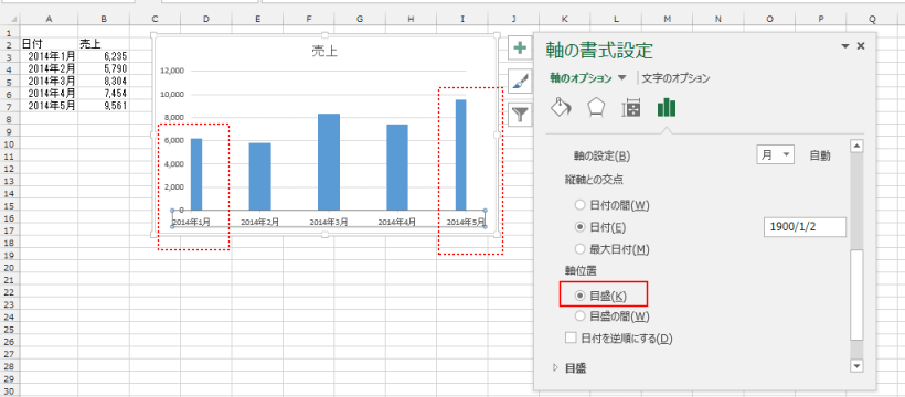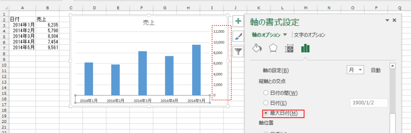 - 縦軸との交点を「最大日付」にすると、縦軸の目盛が右側(最大値)へ移動します。