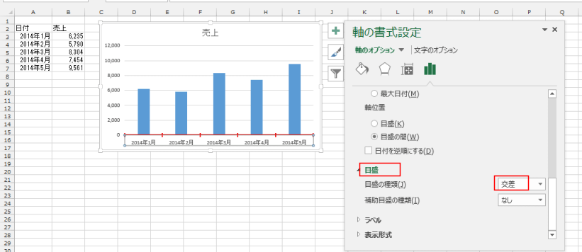 - 下図は目盛の種類を「交差」にした例です。
