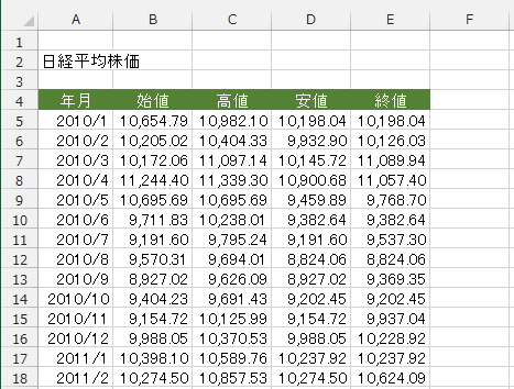 - 下図のようなデータを基にして株価チャートを作成してみます。