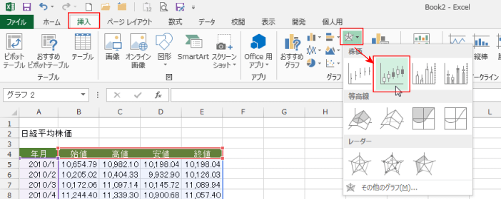 - [挿入]タブのグラフグループにある[株価チャート、等高線グラフ、またはレーダー チャートの挿入]→[株価チャート(始値-高値-安値-終値)]を選択します。