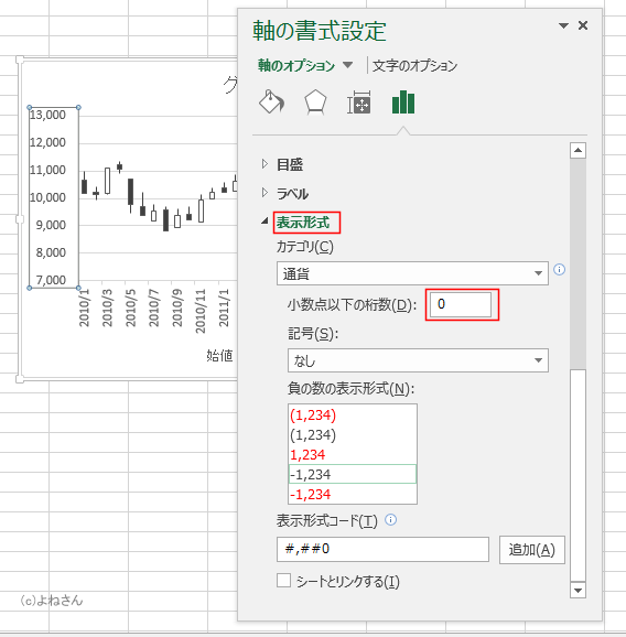 - 表示形式を選択して、小数点以下の桁数を「0」にしました。