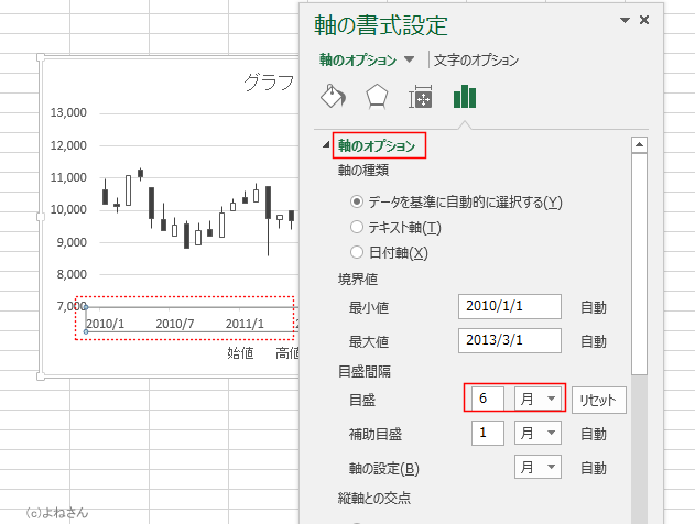 「軸のオプション」を選択して、目盛間隔を「6」「月」に設定しました。