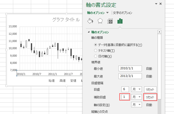 - 軸オプションの補助目盛に「2」と入力します。すると右端の「自動」が[リセット」に変化します。
