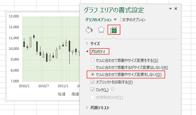 - [サイズとプロパティ]を選択します。[プロパティ]を選択して、「セルに合わせて移動やサイズを変更しない」にチェックを入れます。