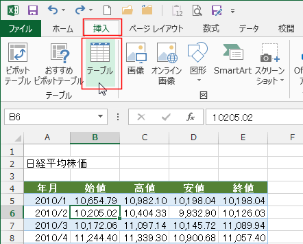 [挿入]タブの[テーブル]を実行します。
