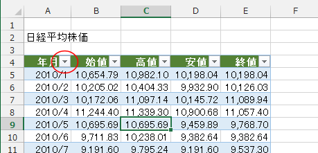 - 列見出しにフィルターボタンが表示されました。データ範囲がテーブルに変換されました。