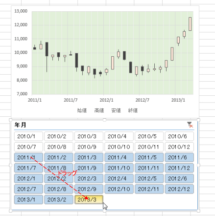- スライサーの日付をドラッグして選択しました。