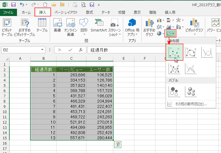 [挿入]タブの[散布図(X,Y)または バブルチャートの挿入]→[散布図]を実行します。