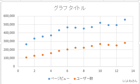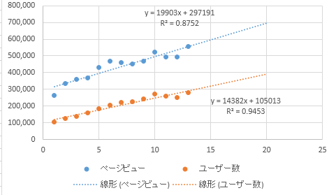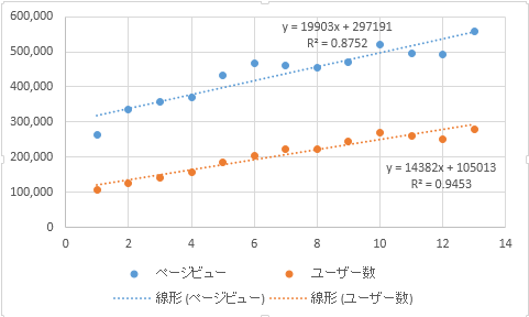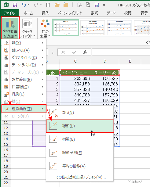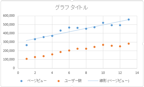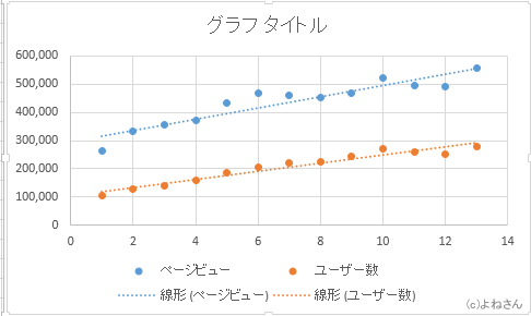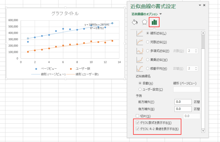 - 同様に、系列「ユーザー数」の近似曲線も追加しました。