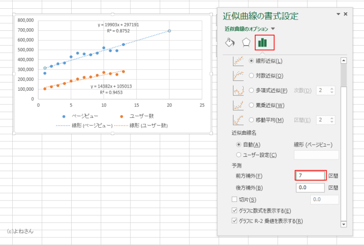 - 同様に、ユーザー数の近似曲線を選択して、予測の「前方補外」に「7」と入力します。