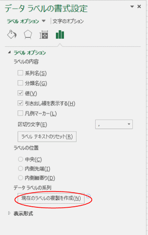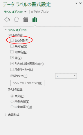 | 「データラベルの系列」という項目があります。 ラベルの内容に「セルの値」がありません。 |
