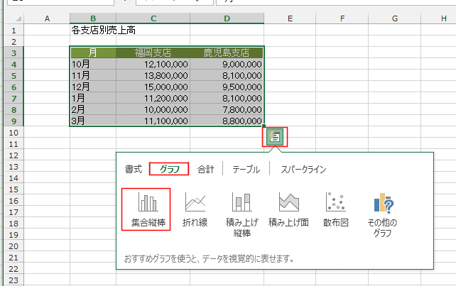 選択した範囲の右下に表示される「クイック分析ツール」ボタンをクリックします。