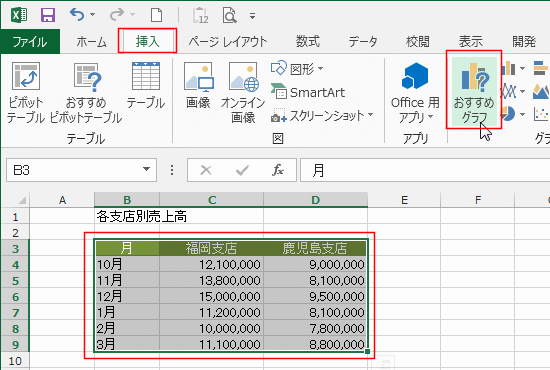 - グラフにするデータ範囲を選択します。下図ではB3:D9を選択しています。