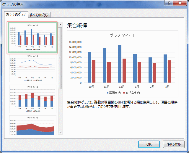 - 左に数種類のグラフが表示されます。作成したいグラフの種類を選択して[OK]ボタンをクリックするか、ダブルクリックします。
