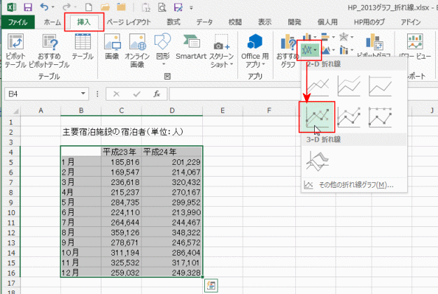 よねさんのExcelとWordの使い方|エクセル2013基本講座:目次|グラフの使い方|折れ線グラフの作り方