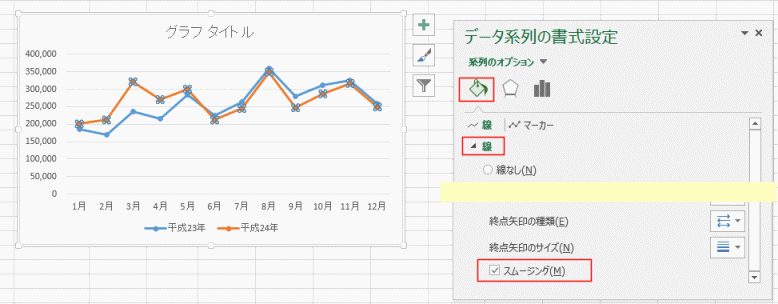 - もう片方の系列を選択して、同じように線の「スムージング」にチェックを入れます。