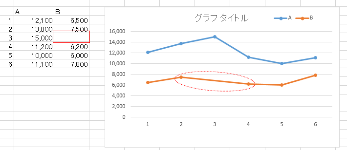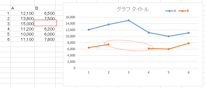 - 下図のようにデータリストの一部が空欄の場合は折れ線グラフが途切れてしまいます。