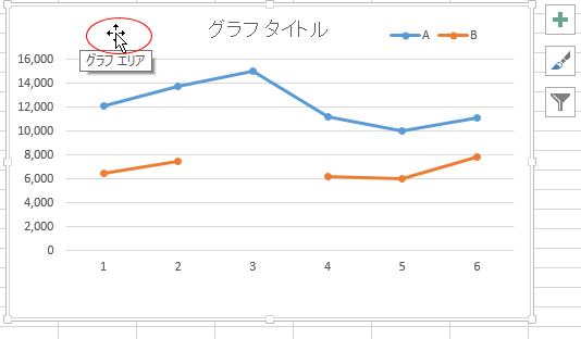 グラフ内でマウスをポイントすると「グラフエリア」と表示されます。「グラフエリア」と表示されたらクリックします。