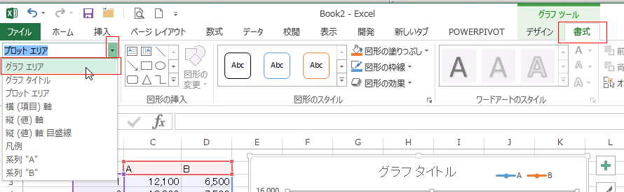 - グラフツールの書式タブでグラフ要素の「グラフエリア」を選択して、グラフ全体を選択する方法もあります。