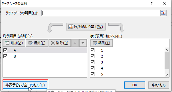 - データソースの選択が表示されます。下にある[非表示および空白セル]ボタンをクリックします。