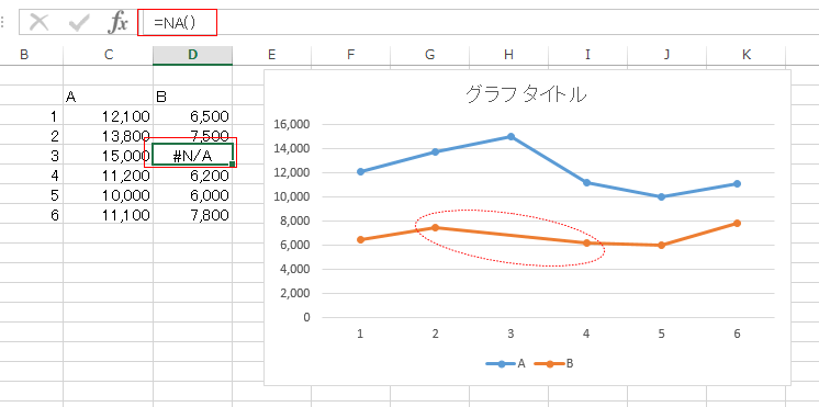 セルには #N/A と表示されますが、折れ線グラフはデータが補間されて線で結ばれます。