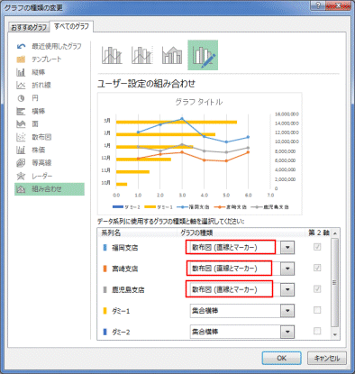 - 系列「福岡支店」「宮崎支店」「鹿児島支店」のグラフの種類の[▼]ボタンをクリックして、「散布図(直線とマーカー)」を選択します。
