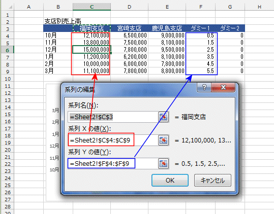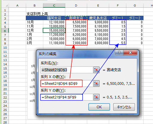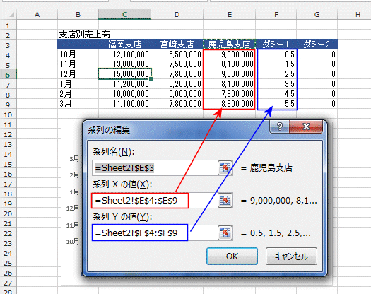 - 系列「鹿児島支店」のXの値にデータリストのデータ部分、系列のYの値にデータリストのダミー1の値の部分を指定します。