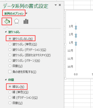 系列のオプションで塗りつぶしなし、枠線を「線なし」として見えなくすることができます。