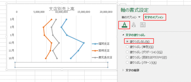 - 横軸を選択して、フォントの塗りつぶしを「塗りつぶしなし」として見えないようにしました。