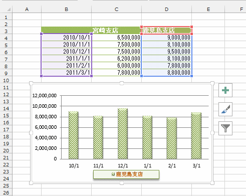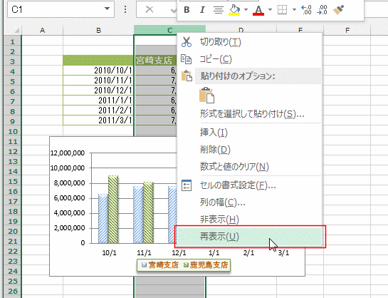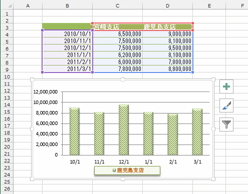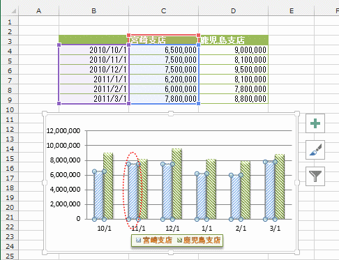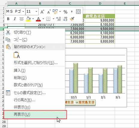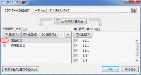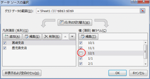 - Excel2013ではデータソースでもグラフのデータを非表示にすることができるようになっています。