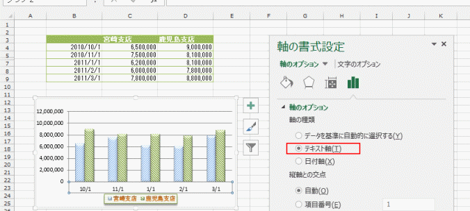 軸のオプションの軸の種類を「テキスト軸」にすると「12月」は表示されません。