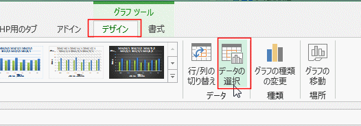 - グラフツールの[デザイン]タブを選択し、[データの選択]を実行します。