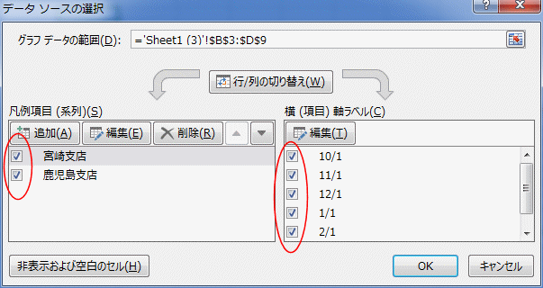 - Excel2013では凡例項目(系列)と横(項目)軸ラベルにチェックボックスが配置されています。
