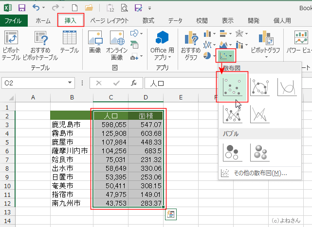 [挿入]タブの[散布図(X,Y)または バブルチャートの挿入]→[散布図]を実行します。