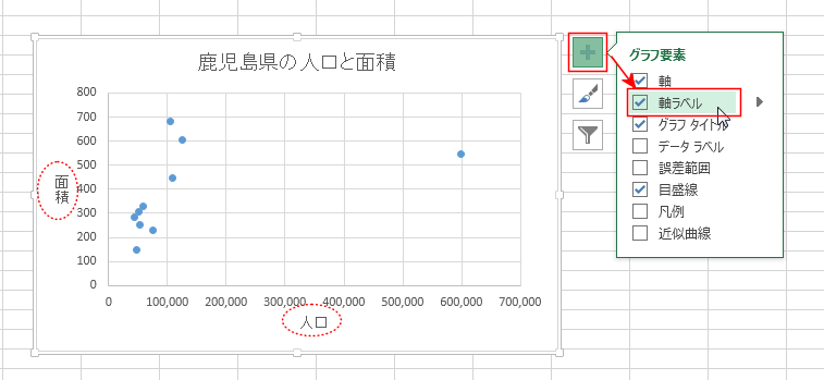 - グラフ要素で「軸ラベル」にチェックを入れて、横軸と縦軸のラベルを入力しました。