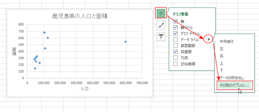 ここでの例で「鹿児島市」のデータを表示しないようにするには、軸目盛を変更することでも対処できます。