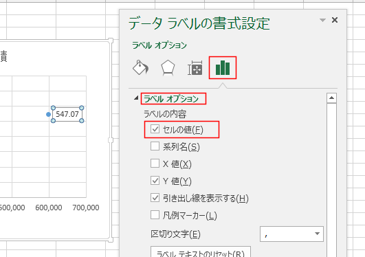 - ラベルオプションを選択して、「セルの値」にチェックを入れます。
