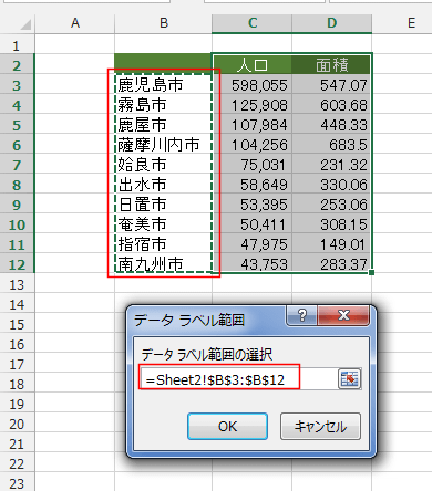データ ラベル範囲の選択に、市名が入力されているセル範囲を指定します。